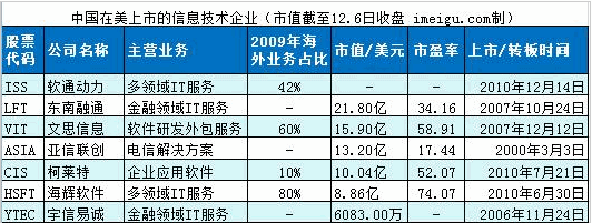 目前,軟通動力等多家中國信息技術公司已在美國上市。以下是各大公司的主營業務、上市時間及市值、市盈率等。