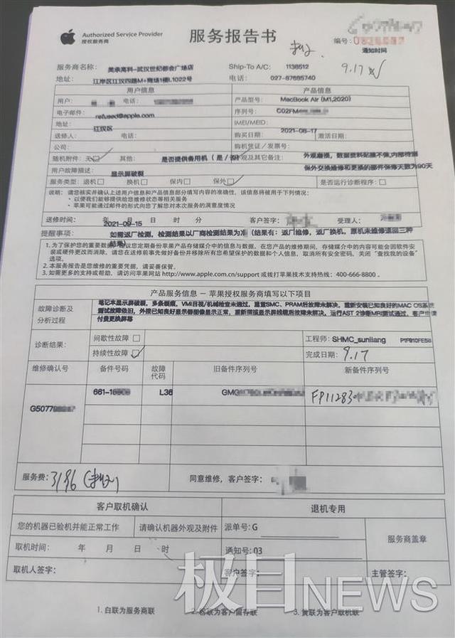 “本以為國際知名品牌的產(chǎn)品很靠譜,沒想到用了一個月就成了‘定時炸彈’!” 9月18日,站在美成高科武漢世紀(jì)都市廣場店的維修柜臺前,齊女士怒不可遏。面對這位蘋果指定維修商,雖然她極力解釋,但店家始終堅稱其送修的蘋果M1處理器Air筆記本的屏幕裂痕是人為造成的,而且維修費更貴。超過3000元必須由公司支付。齊女士個人負(fù)責(zé)。